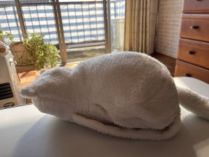 寒さが苦手なのと飼い猫ビビが旅立って、私が落ち込んでいたから…ビビ😻の代わりだよ…とプレゼントしてくれました☺️ 左側の腰の辺りに黒の🖤の模様があったらまさしくビビです❣️ 生前ビビが枕の上で寝ていたから、夜中に枕の横に置いて顔をくっつけるとまるでビビ😻が傍にいるようで、ゴロゴロと聞こえてきそうで🥺